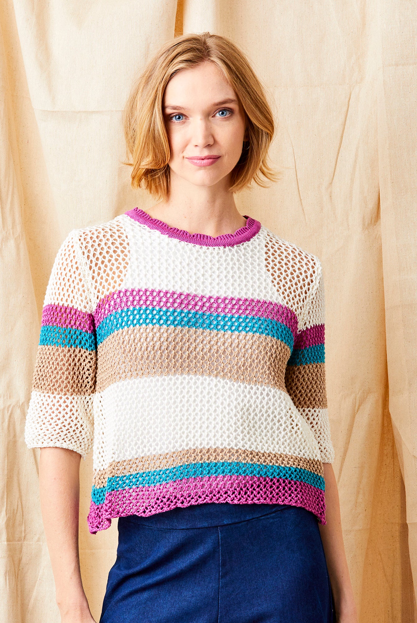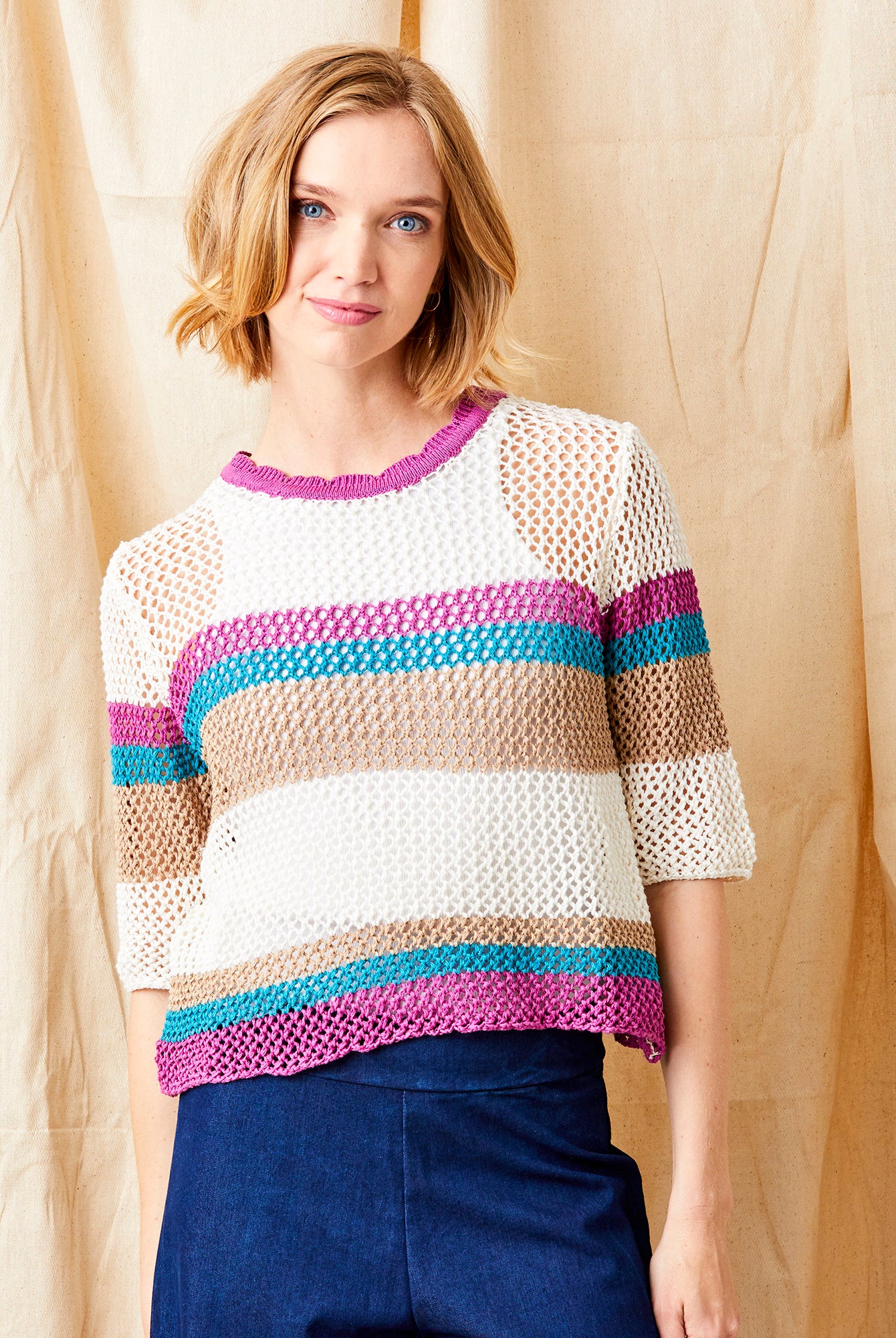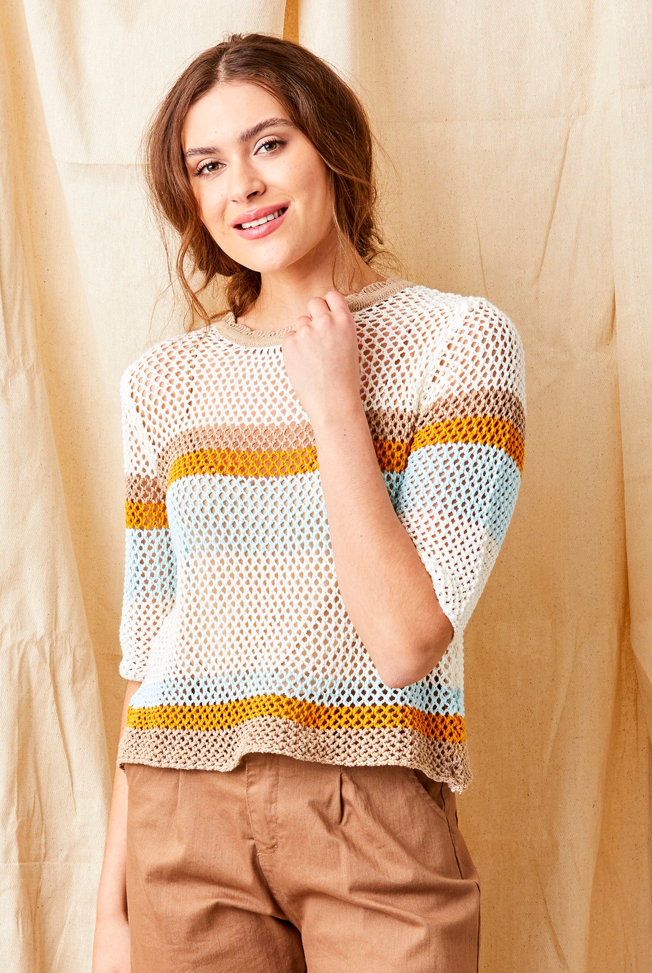 Faylin Open Weave Round Neck Knit with Stripes