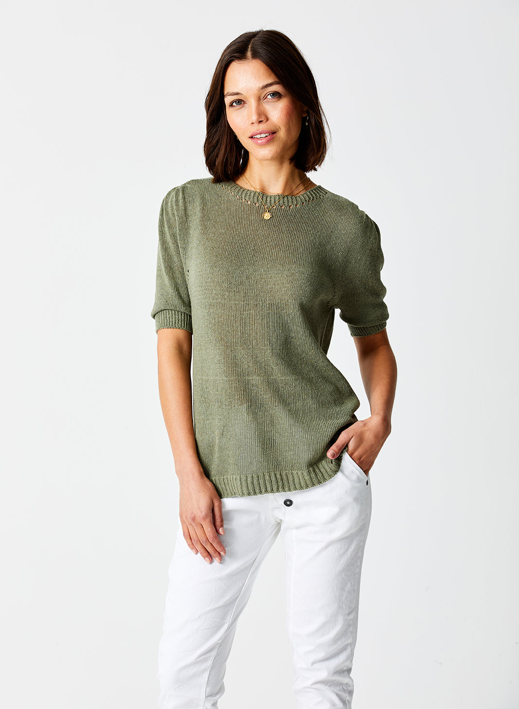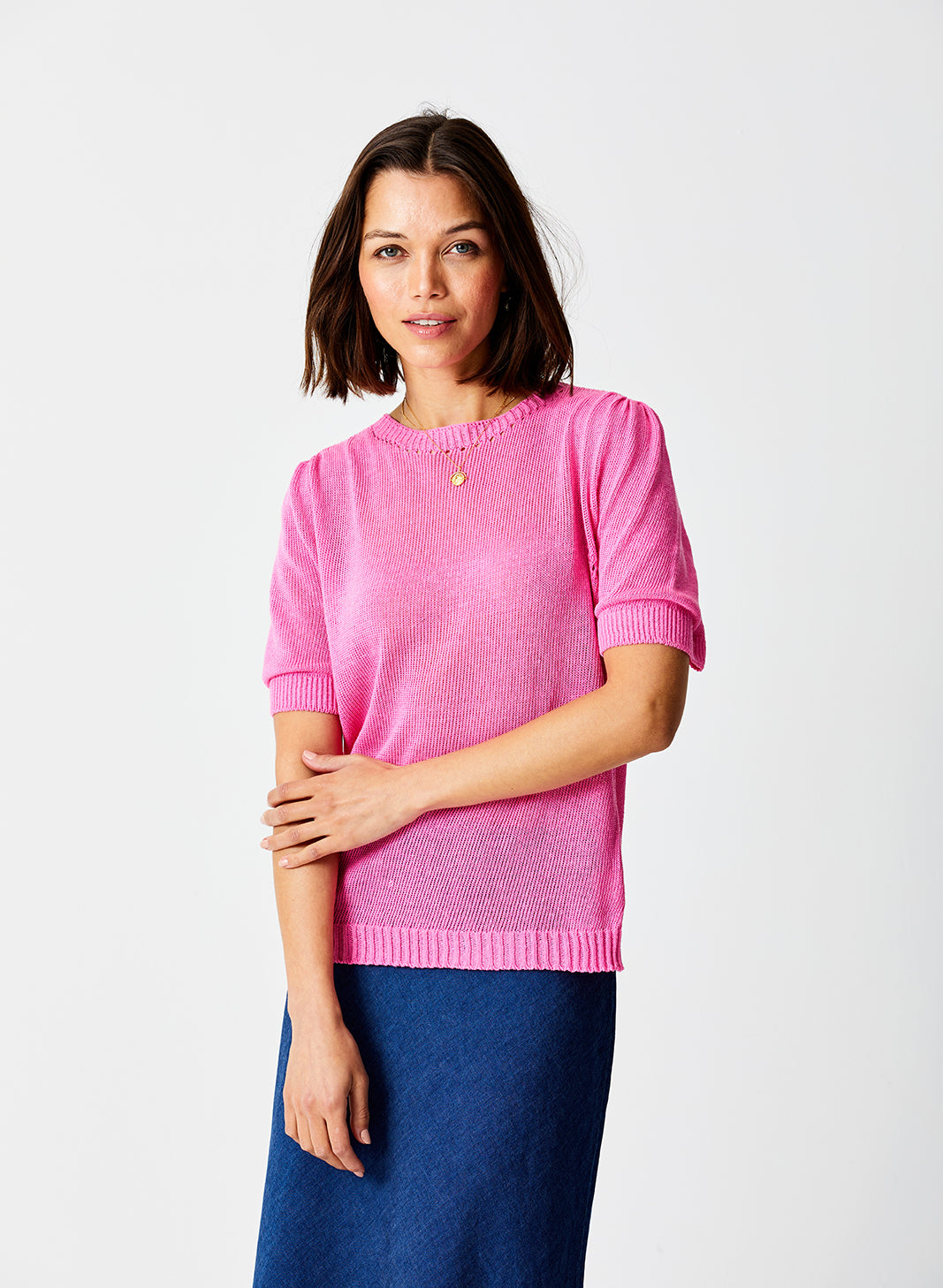 The Fidela Puff Sleeve Knit is the epitome of lightweight spring fashion. Crafted from soft cotton fabric and featuring a high round neck, this T-shirt offers a polished take on traditional knitwear. The breathable yarn and comfortable T-shirt sleeves make it a versatile and chic addition to your wardrobe.