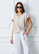 Elevate your summer style with our Seville Short Sleeve Linen Shirt! The tie detail adds a touch of sophistication to this stylish shirt. Versatile enough to dress up or down, and pairs perfectly with both jeans and linen bottoms. Embrace the warm weather in style and comfort.