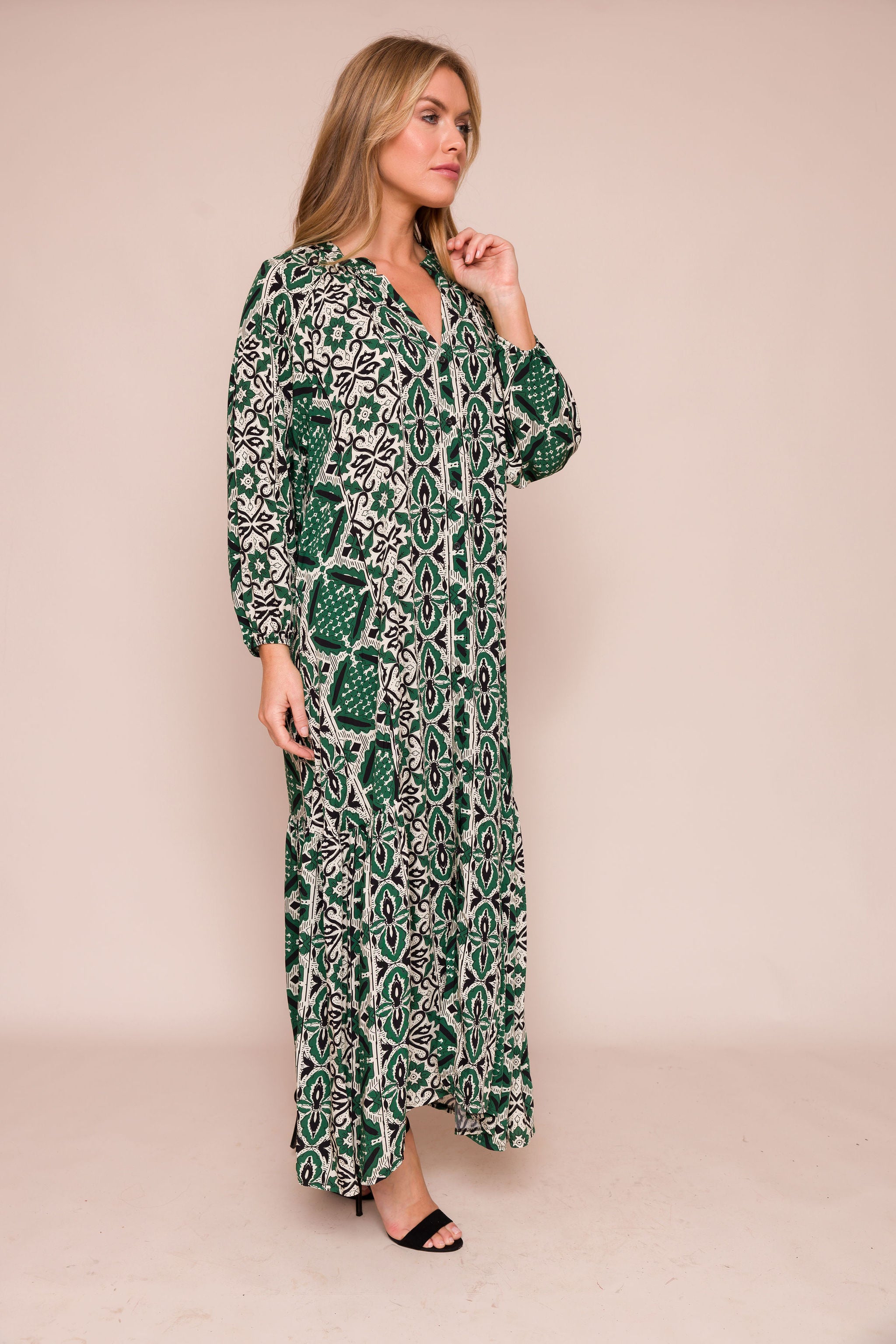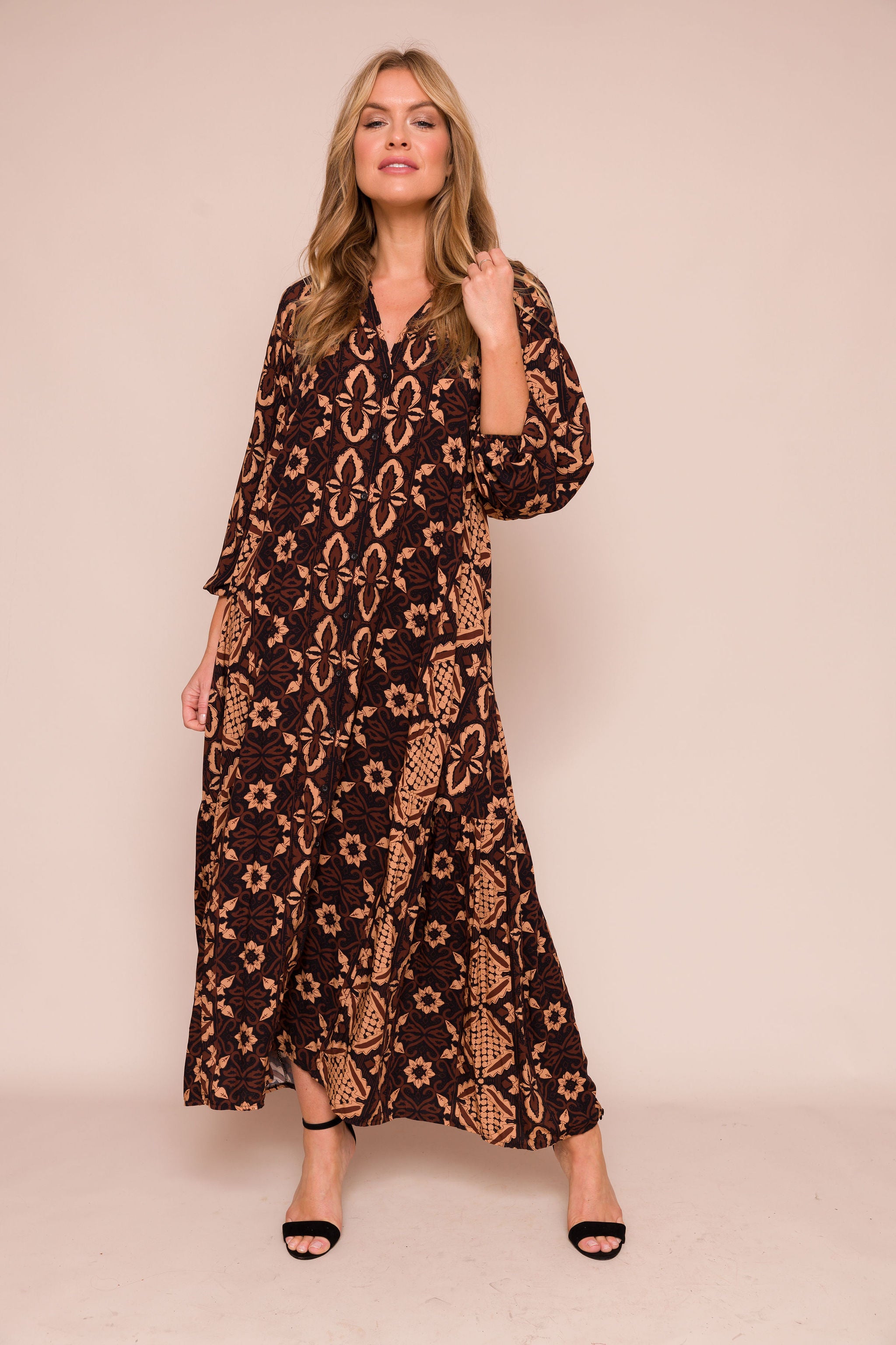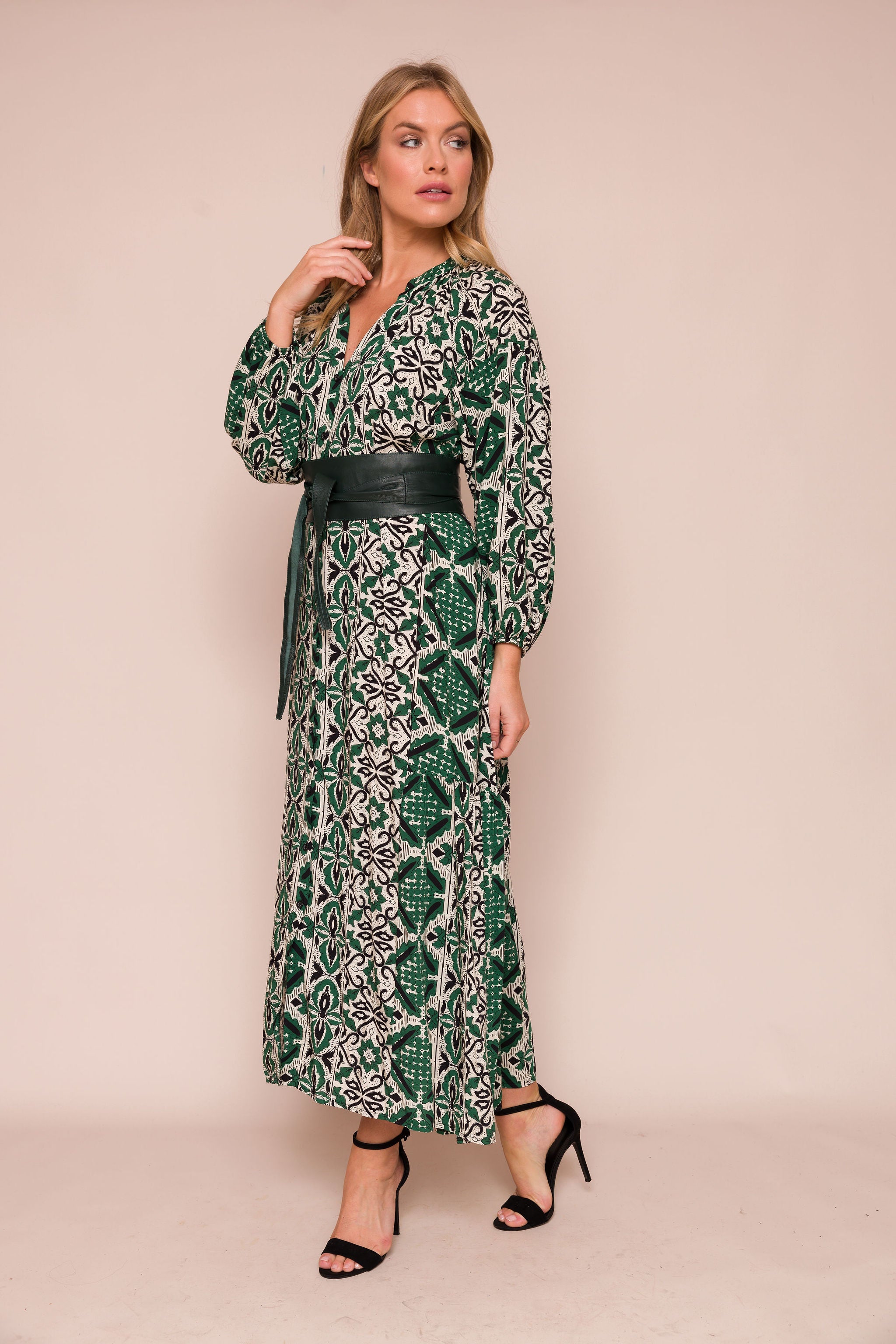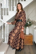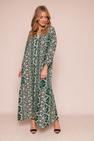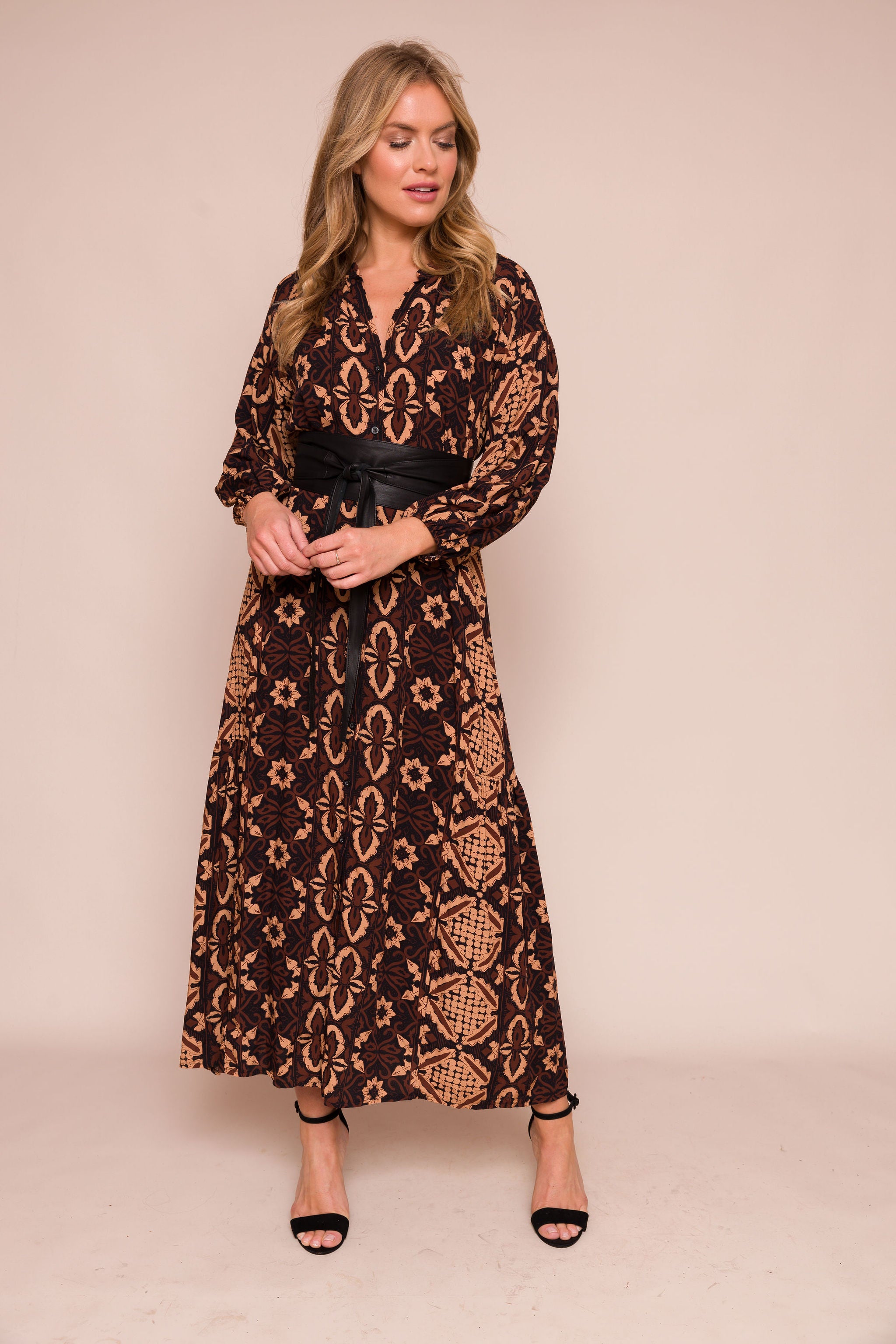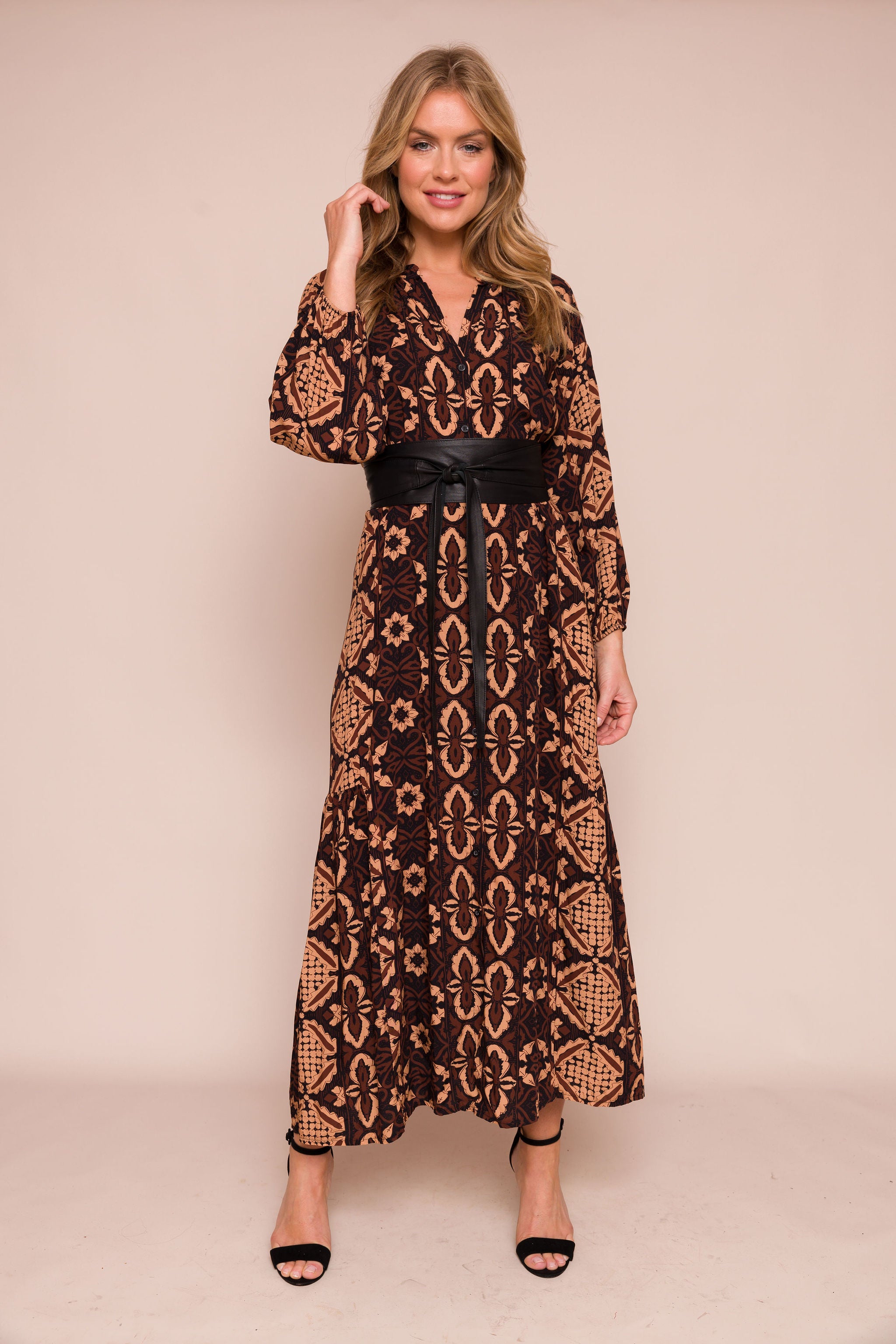 The Kenzie dress means business! Featuring a V neck design, and long sleeves, it features an incredible pattern and a button-down front. Plus, yes, it has pockets! Wear with our beloved Olivia Leather Belt and strappy heels for the ultimate Fall look.