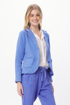 Full of stretch and soft as a feather, this super-sweet cotton jersey blazer is great for throwing on when nights turn a little cool. Designed with tonal buttons, a set of patch pockets and a flattering fit.