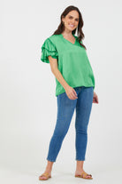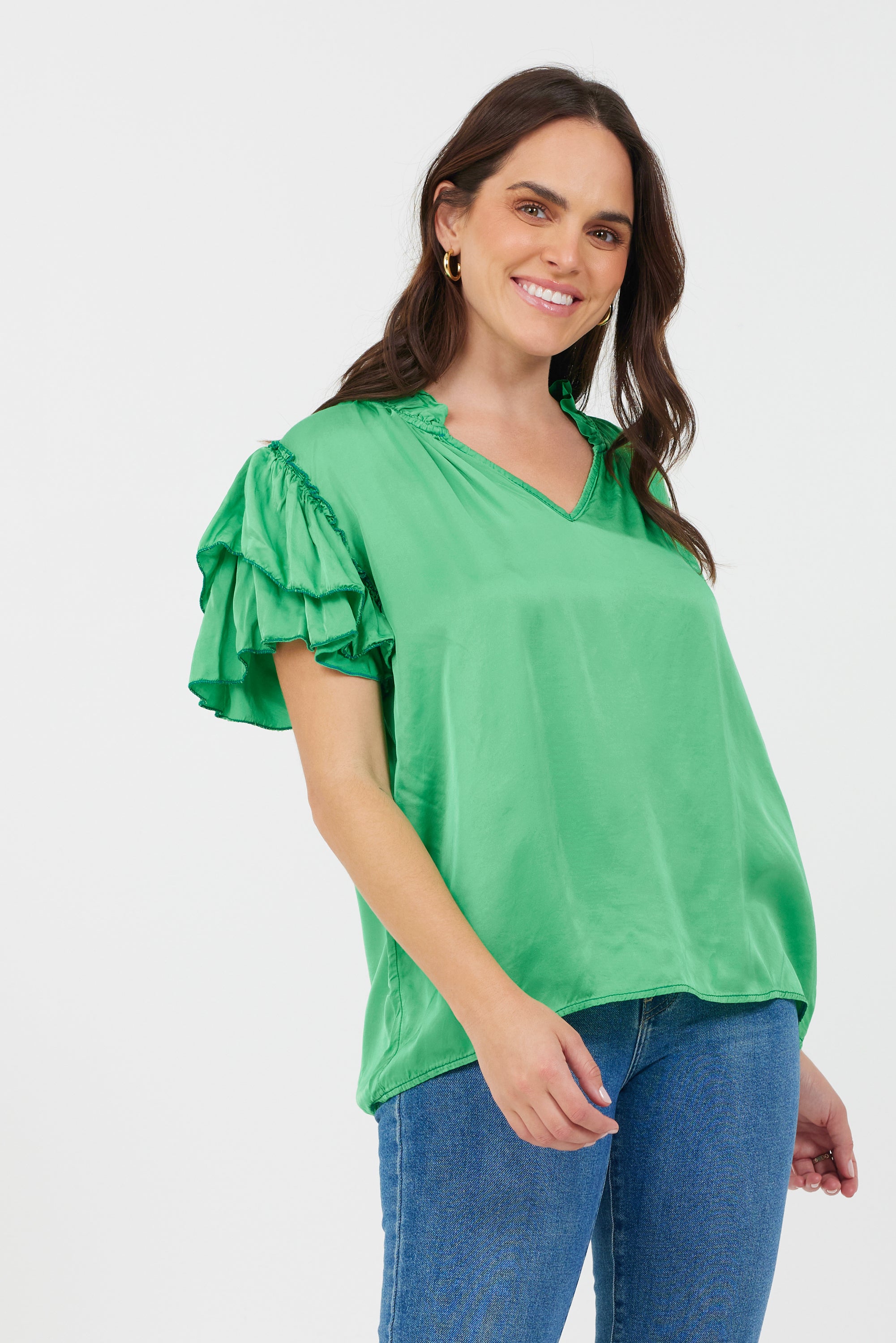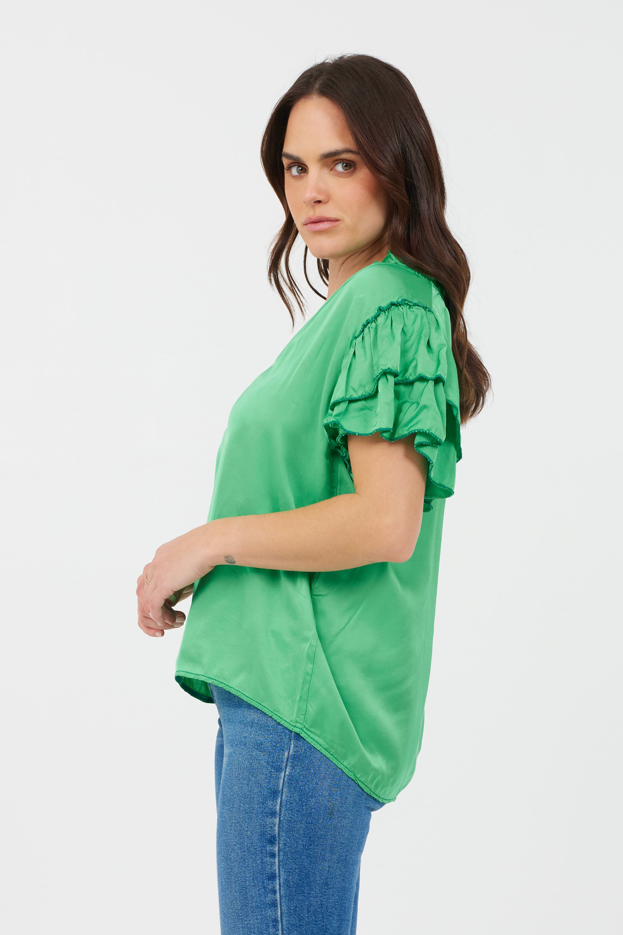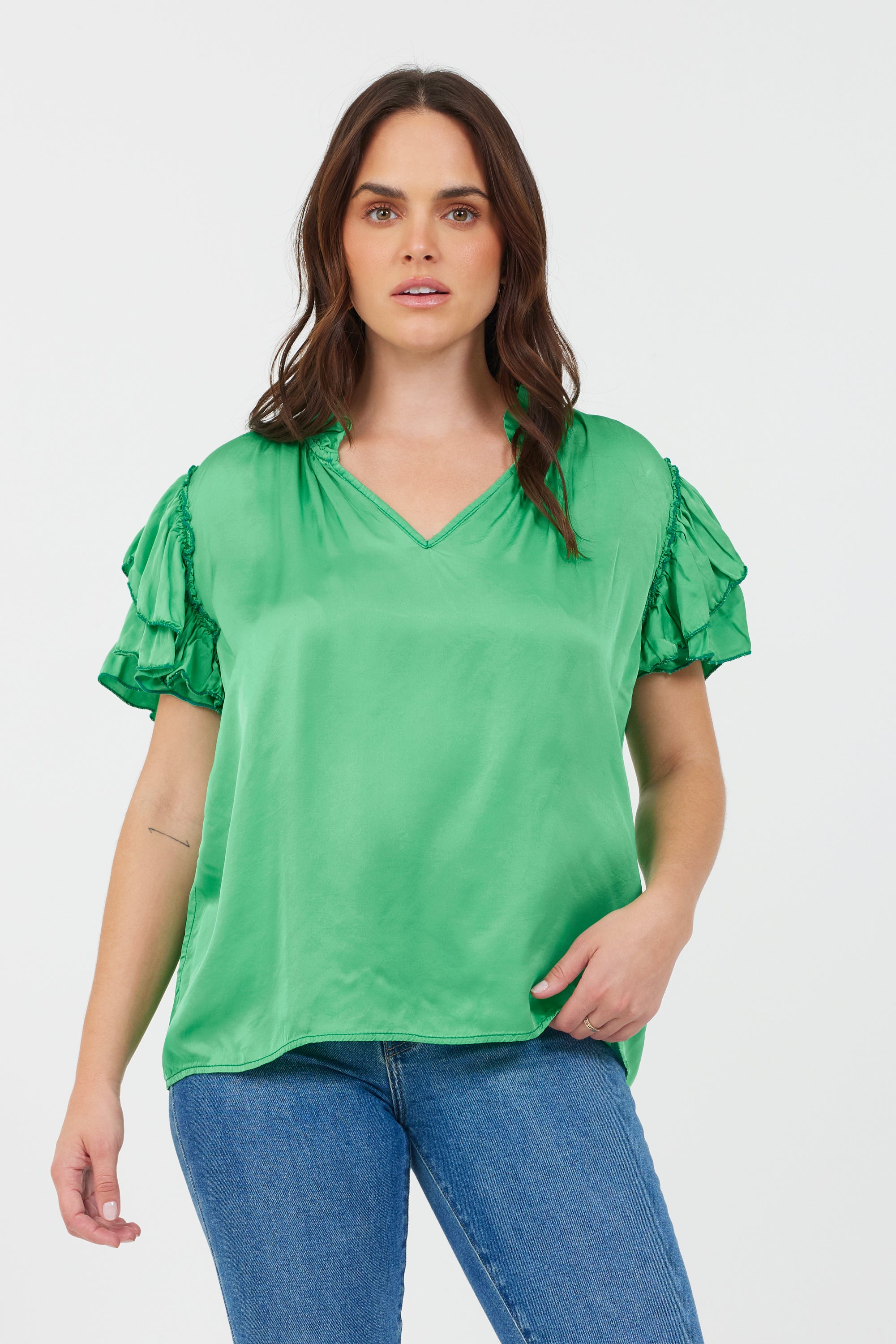 The Pierce Frill Sleeve Tee is the perfect balance of cute and serious style. Featuring an ultra-flattering V-neck neckline and statement frill sleeves, this tee is an ideal choice for any occasion.
