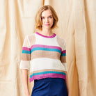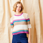 Brighten your wardrobe with this cheerful striped knit featuring a playful colour palette that brings instant joy to any outfit. The relaxed open weave construction keeps things light and breathable, while the three-quarter sleeves strike the perfect balance between coverage and ease. Round neckline and effortless styling make this piece a go-to for casual days when you want to feel put-together without trying too hard.