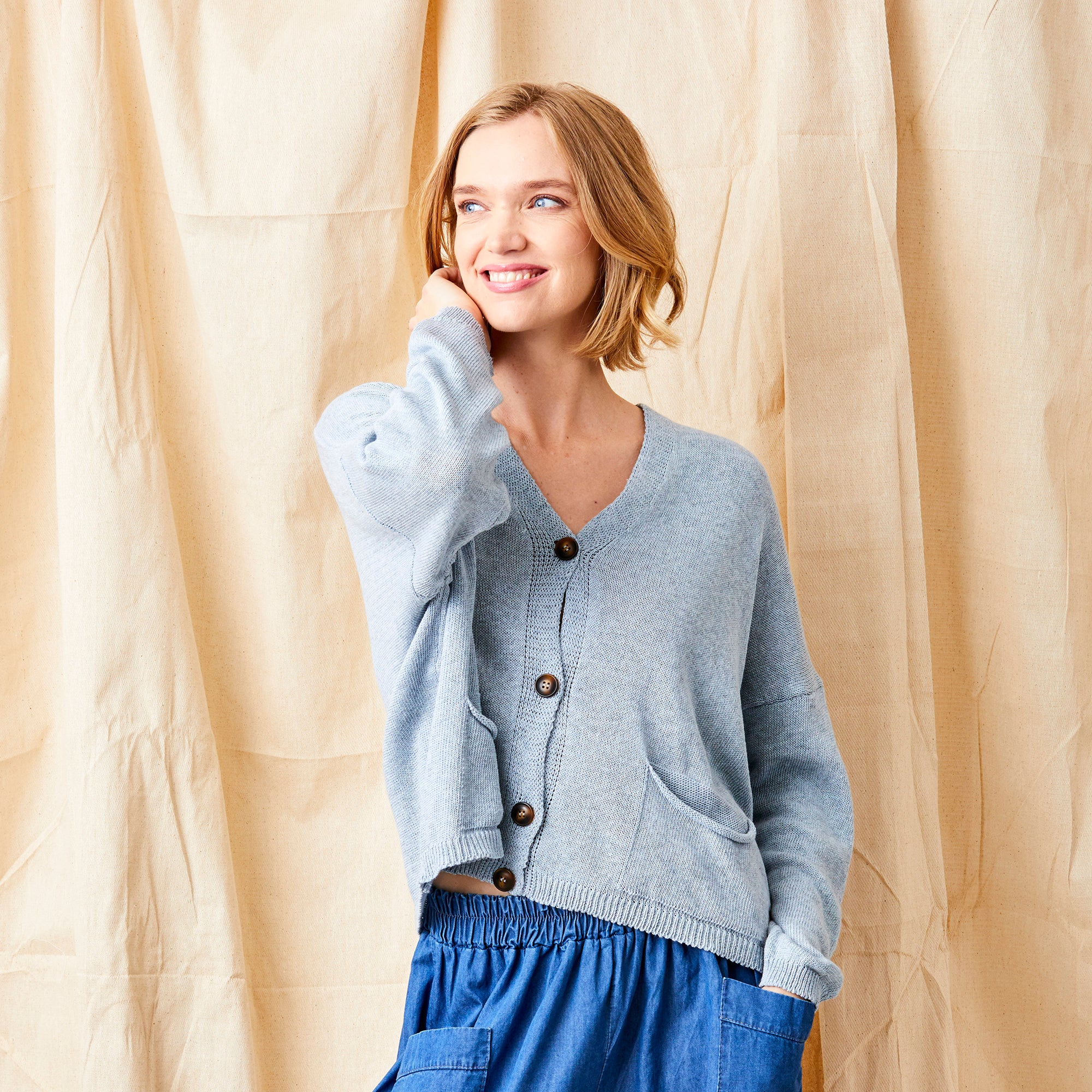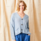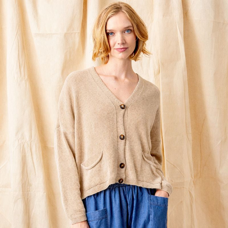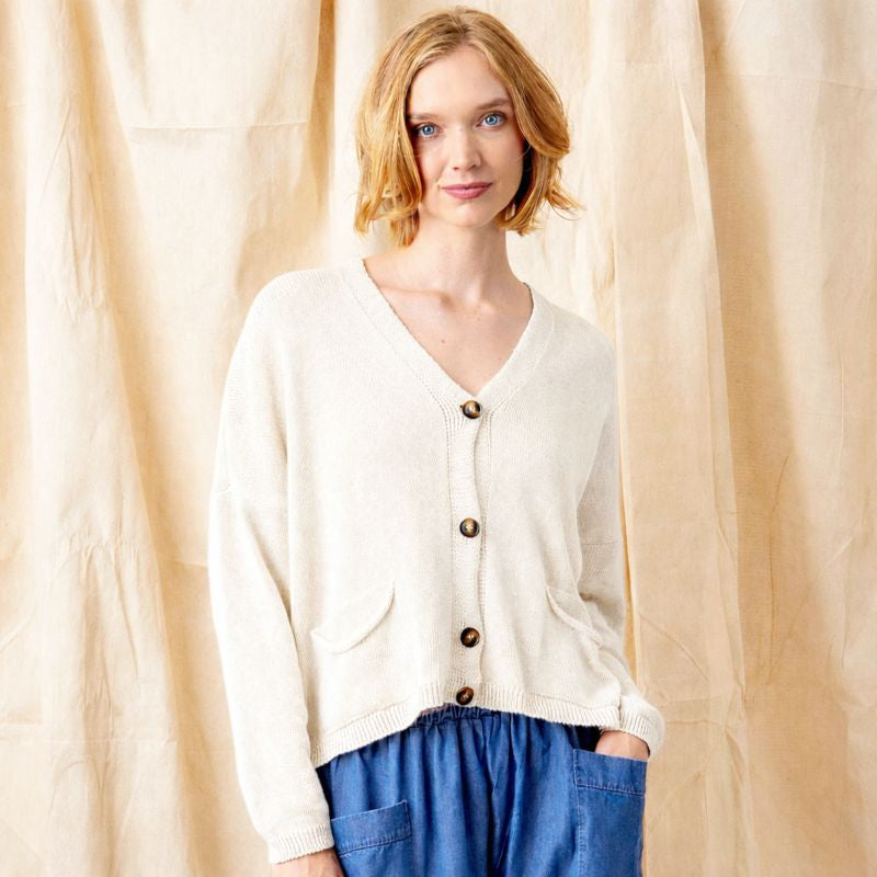 The Fulton Boyfriend Cardigan is the epitome of laid-back elegance. Featuring slouchy pockets on either side and contrast dark buttons down the front, this cardigan is both stylish and functional. The low V-neckline and open yarn lightweight knit make it a versatile piece that can be worn layered over shirts and tops or alone for a relaxed, loungewear look.