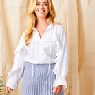 Elevate your everyday wardrobe with this charming cotton shirt, crafted from soft, breathable fabric that feels as good as it looks. Delicate frill detailing adds a playful touch to the neckline and cuffs, bringing personality and movement to your style. Perfect for casual days or dressing up with tailored trousers, this versatile piece transitions effortlessly from season to season. A fun essential that celebrates individuality with understated elegance.