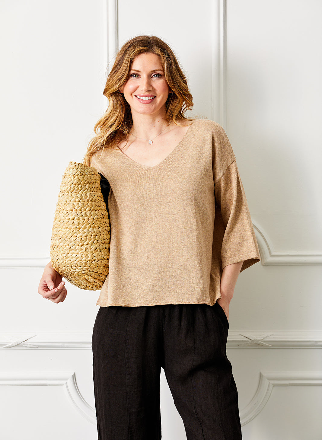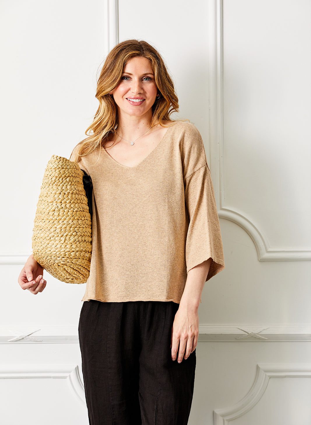 The Fiorenza V Neck Sweater is a sophisticated piece, combining comfort and refined elegance. Made from a lightweight yarn, it features a soft, open V-neck that offers a relaxed, yet put-together, look. The 3/4 length wide sleeves add a touch of sophistication while ensuring comfort and ease of movement.