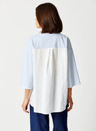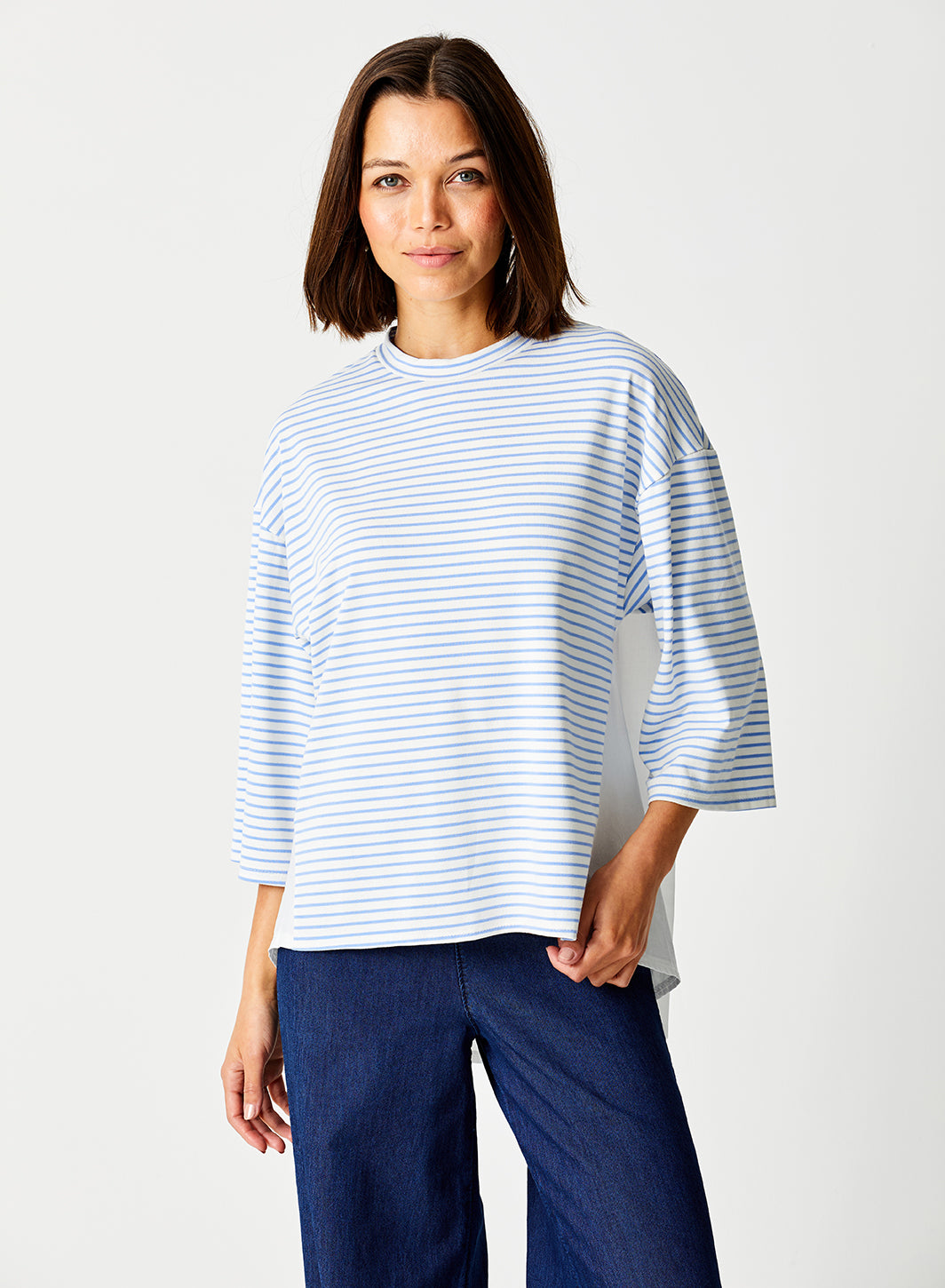 Available in camel and blue, the Glace stripe Hi Lo Hem Jersey Top is a chic addition to your everyday wardrobe. With all the comfort of a simple cotton tee, the sophisticated shirt detailing at the back gives a stylish twist to any outfit. Made from soft cotton material, with 3/4 length sleeves and a loose fit across the back, the Glace top is just as comfortable as it is stylish.