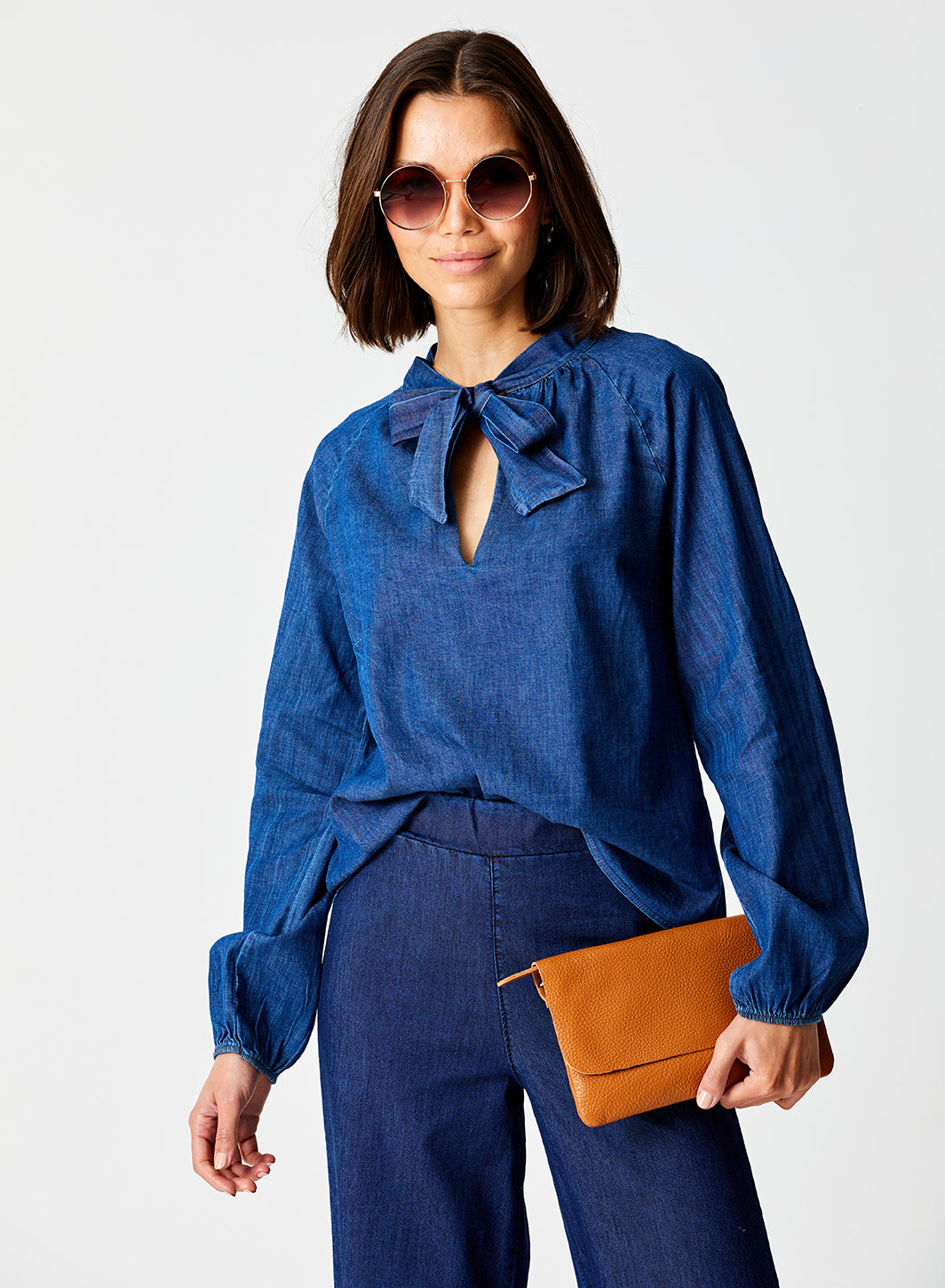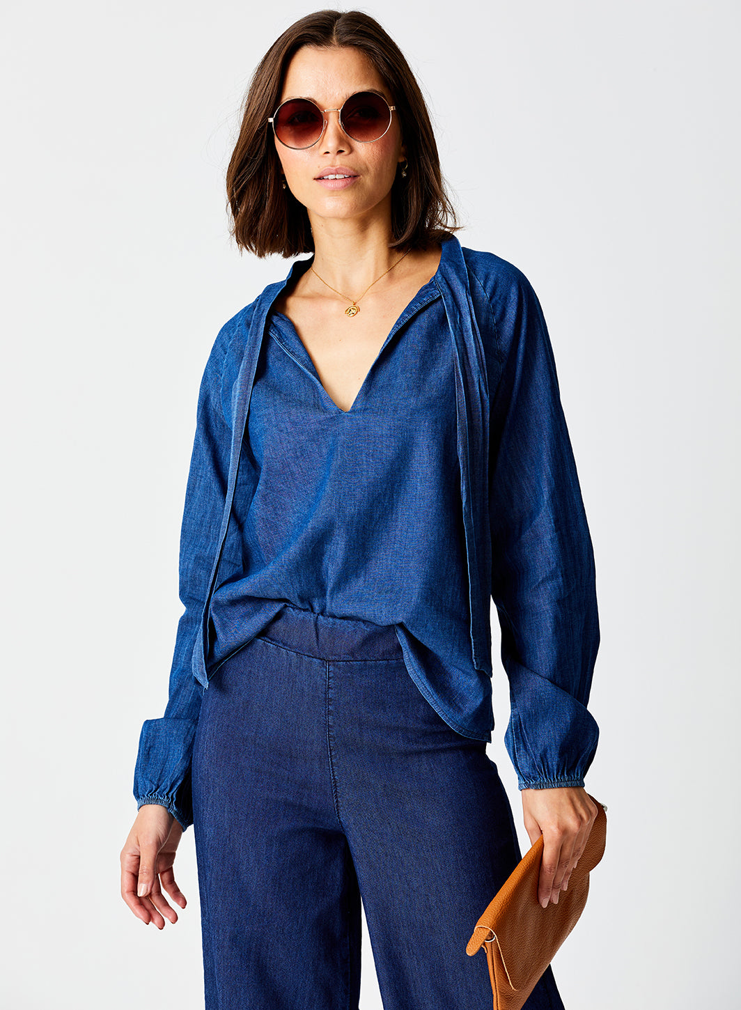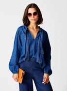 Chic, cool and simply stylish, the Gladstone shirt is a standout piece that you can add to your wardrobe now and wear all season long. This soft denim blouse is designed with two ties at the neckline allowing you to style it in pussybow fashion or leave it open for a more '60s-inspired look. The voluminous sleeves add to the vintage look of the top making it ideal to wear with flared jeans or wide leg trousers.