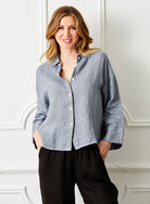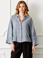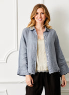 Introducing our Lago Linen Shirt With Wide Sleeves - your new favorite versatile piece! The relaxed fit and hi lo hem provide comfort and style, while the kimono style sleeves add a unique touch. Wear it buttoned up as a shirt or open as a jacket for a variety of looks.