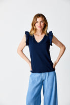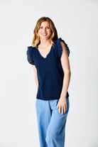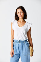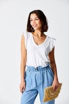 The Mine tee is the ultimate tee for summer dressing. This versatile piece features charming frill cap sleeves and a flattering V-neck style, making it a must-have for your warm-weather wardrobe. Available in an array of colours, the Mina Tee offers endless options to suit your personal style and preferences.